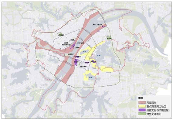 两江四岸地区沿岸及城市主干道一线街坊的区域。
