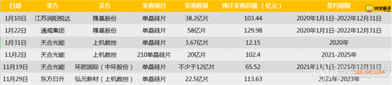 在硅片环节,江苏润阳悦达早在今年初就瞄准了隆基38.2亿片单晶硅片,预计采购总额达103.44亿元,供应期至2022年12月31日。