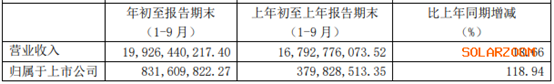 据天合光能2020年Q3报告显示,前三季度实现营收199.26亿元,同比增长18.66%,主要系光伏组件及支架业务销量增加;归属于上市公司股东的净利润8.32亿元,同比增长118.94%,基本每股收益0.45元。