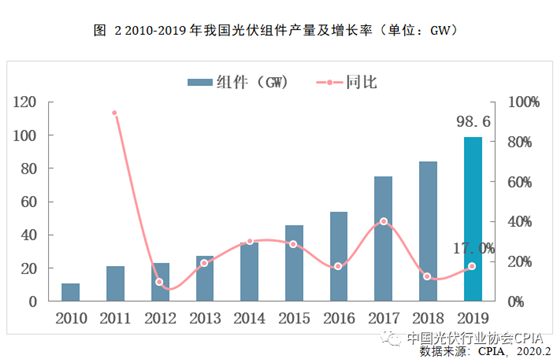 2019年虽然我国光伏新增装机再次同比下降,但是新增和累计光伏装机容量仍继续保持全球第一。2019年,我国新增光伏并网装机容量达到30.1GW,同比下降32.0%;截至2019年底,累计光伏并网装机量达到204.3GW,同比增长17.1%;全年光伏发电量2242.6亿千瓦时,同比增长26.3%,占我国全年总发电量的3.1%,同比提高0.5个百分点。