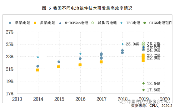 产业化技术方面,多晶硅生产综合电耗已降至70kWh/kg-si,受益于万吨级设备的采用,设备投资成本已下降至1.1亿元/千吨;硅片方面,单晶炉单炉投料量提升至1300kg,铸锭单晶技术已开始产业化应用,158.75mm、166mm等大硅片技术批量生产;晶硅电池组件方面,PERC单晶电池产业化平均效率达到22.3%,N型电池研发、生产规模逐步扩大,60片单晶PERC组件功率达到320W。与此同时,我国光伏企业在PERC、TOPCon、异质结、IBC等高效晶硅电池生产技术、薄膜电池技术研发上先后取得突破,并不断刷新世界记录。