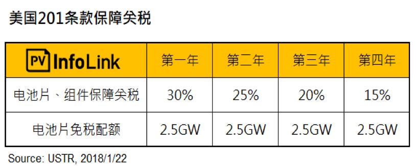 2018年1月22日,特朗普总统确认通过201法案,将对光伏电池片组件在既有反倾销与反补贴税率基础上增加201关税,税率30%,未来4年每年递减5%,每年有2.5GW的进口电池片或组件拥有豁免权。
