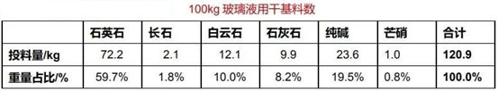 按照100kg玻璃液的产出计算,其用料投入情况如下: