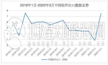 据SOLARZOOM发布的海关总署最新出口数据显示,3月中国组件出口量为7.49GW,较上月环比大幅增长164.6%。1-3月光伏组件组件累计出口量为14.77GW,较2019年同期的17.26GW减少了2.49GW。其中,1月出口量同比降幅最大,达到1.59GW,3月光伏组件出口量略低于去年同期水平,减少0.07GW,整体差距不大。