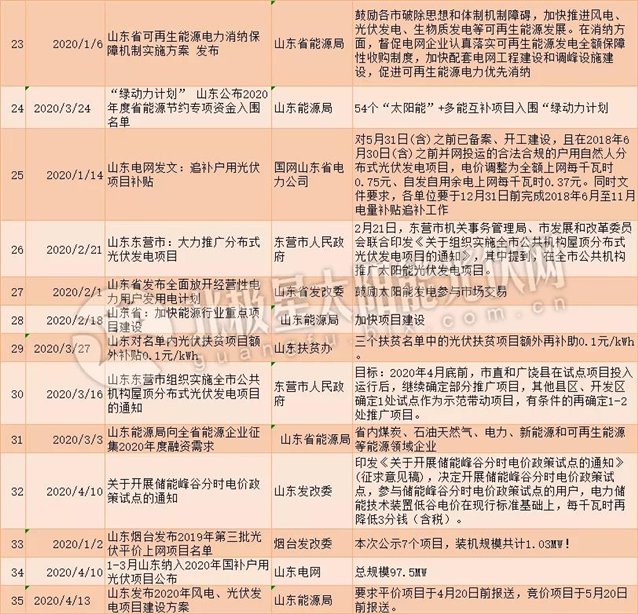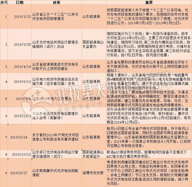 2019年,山东出台了35项光伏相关政策,主要涵盖平价项目、竞价项目、户用光伏项目等,同时积极推进光伏+储能模式等。2019年全国各地平价项目陆续启动,山东第一批光伏平价上网项目(试点)7个,装机容量达到91万千瓦,之后,烟台、淄博陆续公布了第二批、第三批平价项目。