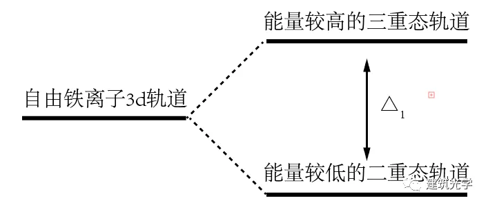 自由铁离子的5个d轨道具有相同的能量值,也就是我们所说的五重简并,但在玻璃中配位场的作用下,简并的d能级会分裂,对于4面体配位,d能级分裂为能量较高的三重态轨道和能量较低的二重态轨道,对于8面体配位,d能级分裂为能量较高的二重态轨道和能量较低的三重态轨道,如图1所示,△1与△2表示铁离子d能级电子从能量较低的轨道跃迁至能量较高轨道所需的能量。