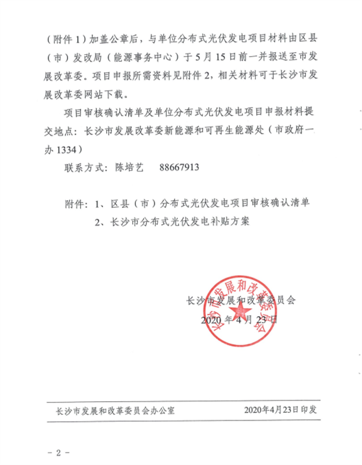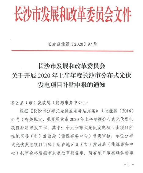 近日,长沙市发改委下发了《关于开展2020年上半年度长沙市分布式光伏发电项目补贴申报的通知》(长发改能源[2020]97号)。按照《长沙市分布式光伏发电补贴方案》(长能源[2016]41号),2014-2020年期间,在长沙市建成且并网发电的分布式光伏发电项目,自并网发电之日起按其实际发电量给予0.1元/千瓦时补贴。2020年上半年度长沙市分布式光伏发电项目补贴申请资料由区县(市)发改局(能源事物中心)于5月15日前一并报送至市发改委。全文如下: