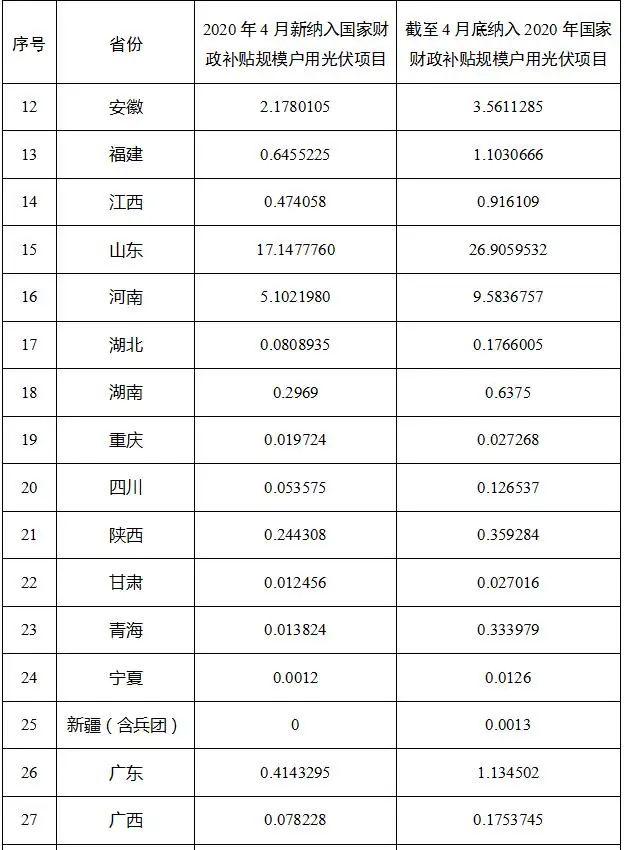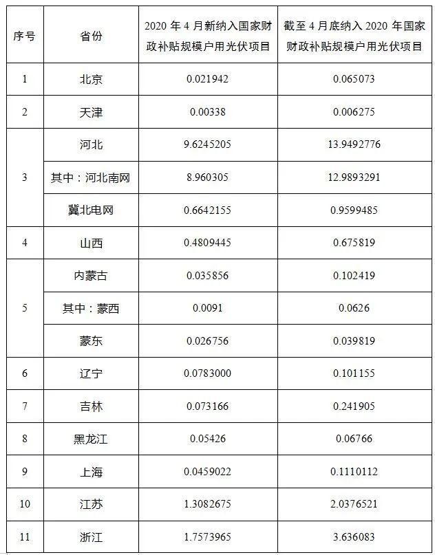 注:1.天津、江苏、河南、陕西、广东、广西、云南、贵州根据实际情况对3月底前建成并网户用光伏项目进行了修正,具体项目信息见各省公布情况。