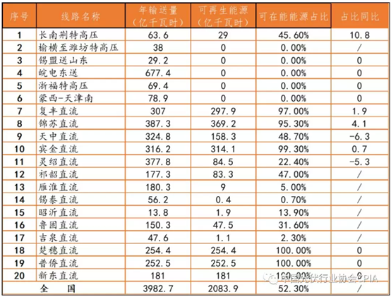根据国家能源局发布的《2018年度全国可再生能源电力发展监测评价》,2018年,20条特高压线路年输送电量3,983亿千瓦时,其中输送可再生能源电量2,084亿千瓦时,占全部年输送电量的52%。国家电网公司经营区覆盖范围内的17条特高压线路输送电量3,295亿千瓦时,其中可再生能源电量1,396亿千瓦时,占输送电量的42%;南方电网公司经营区覆盖范围内的3条特高压线路输送电量688亿千瓦时,全部为可再生能源电量。