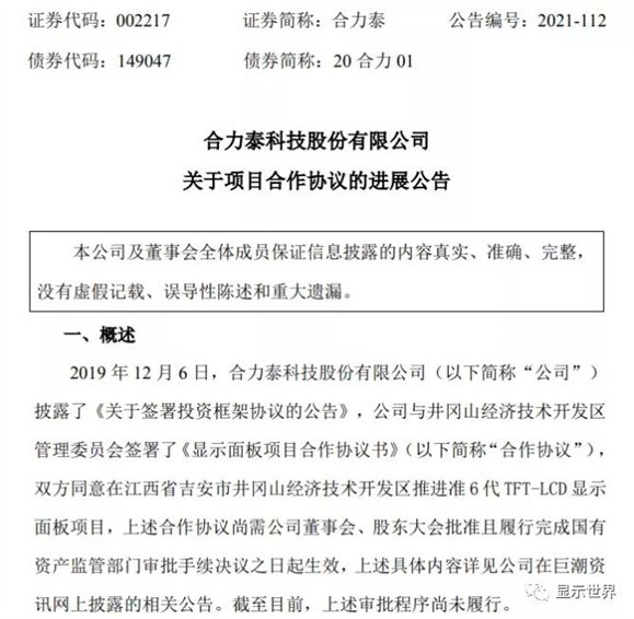 10月13日,合力泰发布公告,此前披露,公司与井冈山经济技术开发区管理委员会签署了《显示面板项目合作协议书》,双方同意在江西省吉安市井冈山经济技术开发区推进准6代TFT-LCD显示面板项目。鉴于市场环境变化并结合公司实际经营情况,公司决定终止上述合作协议项下的项目投资计划。此次终止,有利于公司聚焦资源和精力提升主营业务,不会对公司生产经营产生重大影响。