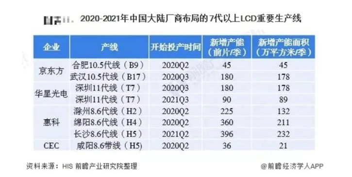 目前,中国LCD生产厂商也主要是在高世代LCD上进一步布局,2020-2021年京东方、华星光电、惠科、CEC陆续在2020-2021年中国大陆投产共计8条7代以上的重要生产线。