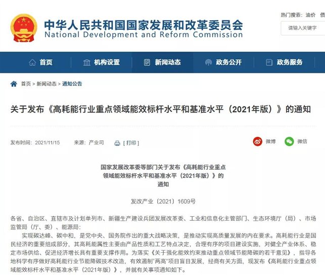 了解到,国家发展改革委、工业和信息化部、生态环境部、市场监管总局、国家能源局近日联合发布《高耗能行业重点领域能效标杆水平和基准水平(2021年版)》,以落实《关于强化能效约束推动重点领域节能降碳的若干意见》,指导各地科学有序做好高耗能行业节能降碳技术改造,有效遏制“两高”项目盲目发展。