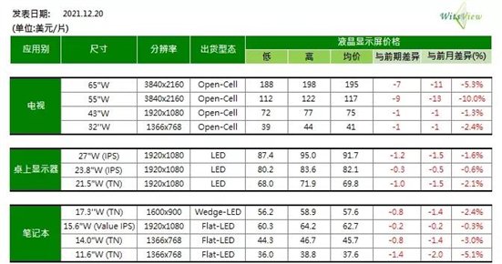 WitsView 2021 12月下旬 面板价格快报