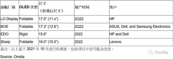 表1: 其他面板厂商对OLED笔记本面板的2022年计划