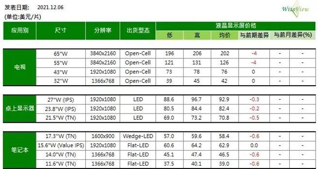 11月电视面板价格出现触底的讯号,12月也将维持缓跌的走势,TrendForce研究部副总范博毓表示,单月跌幅有望缩小到5%上下。不过IT面板进入传统淡季,12月包括监视器和笔电面板,各尺寸全面下跌,不过跌势有深有浅。