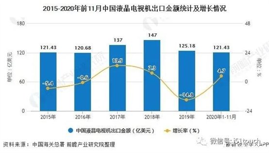 2015-2020年前11月中国液晶电视机出口金额统计及增长情况