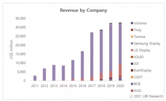 报告表示,三星显示(Samsung Display,SDC)2020 年的收入下降了 15.8%,降至 223 亿美元。该公司去年出货了 3.9 亿片 OLED 面板,市场份额为 68.2%。
