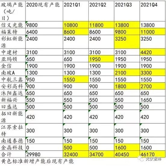 从这张图可以看出,今年第二季度的产能就基本能满足今年的市场需求,到第四季度,光伏玻璃的产能就能满足明年的市场需求,所以2021年新建的产能可能在2022年投产就会存在产能过剩的情况。光伏玻璃龙头信义在公布2020年财报时,也有消息透露,预测下半年光伏玻璃价格将会大幅下降至30元/平米(以下)。