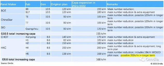 尽管仍有绵阳及长沙产线在产能爬坡,惠科是进行产能扩产比较积极的厂商之一。其重庆的8.6代H1产线最初建造时,设计产能只有75k/月;但是经过几轮产能扩充,该产线目前最大月投片预计已经能超过100k/月。而其滁州H2产线设计产能为150k/月,当前最大投片也已经接近180k/月的水平。产能爬坡之中的绵阳H4产线,设计产能为150k/月,预计产能扩产后,能达到最大产能约200k/月;长沙的H5产线,LCD设计产能为120k/月,将来产能扩产的目标,预计最少能到150k/月 ─ 甚至有消息显示可能最终目标,加上规划之中的OLED产能,可能达到最大投片能力200k/月的产能。