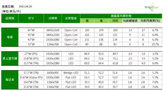根据调研机构最新公布的4月面板报价,4月下旬电视、笔电和显示器等三大应用的涨幅均较3月扩大,电视面板平均涨幅超过6%;面板报价已经连续11个月涨,预期5月还会再走升。