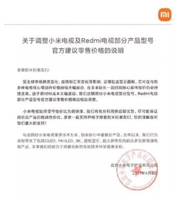 4月8日,小米电视发布公告称,迫于原材料成本大幅波动,小米将对小米电视部分型号、Redmi电视部分产品型号官方建议零售价格做出相应调整,但会尽可能保证性价比。