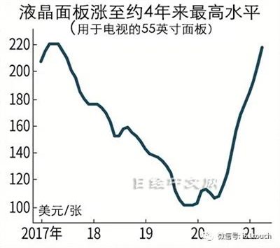 液晶面板4月价格涨至4年来高价。用于电视的大尺寸液晶面板价格正在上涨。用于电视的指针产品涨至2020年春季最低点的约2倍,创出约4年来最高水平。由于全球半导体短缺等影响,液晶面板的零部件供应短缺迹象明显。受宅家需求推动,以美国为中心的电视销售火爆。有分析认为,零部件短缺的化解需要较长时间,价格高位运行有可能持续一段时间。
