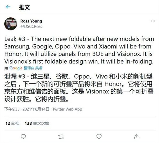 屏幕研究机构 DSCC 首席执行官 Ross Young 指出,荣耀即将加入“可折叠手机俱乐部”。Young 指出荣耀正在研发该品牌首款可折叠手机,预估会在三星、Google、OPPO 和 vivo 之后发布这款手机。