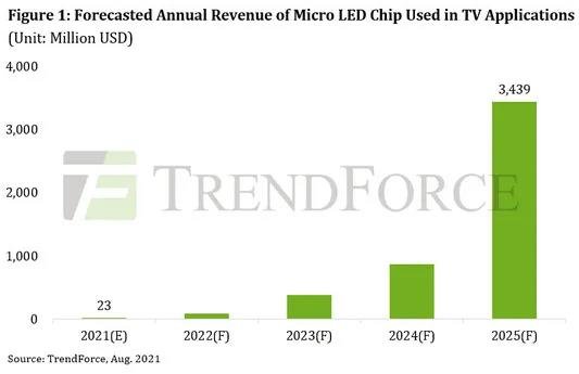 根据TrendForce最新发布的《2021年Mini / Micro LED自发光显示趋势及供应商战略分析》报告,2025年用于电视的Micro LED芯片的年营收预计将达到34亿美元,2021-2025 年期间的年复合增长率为250%。这种增长主要归功于显示厂商早期的计划,即对大尺寸显示屏采用Micro LED技术。