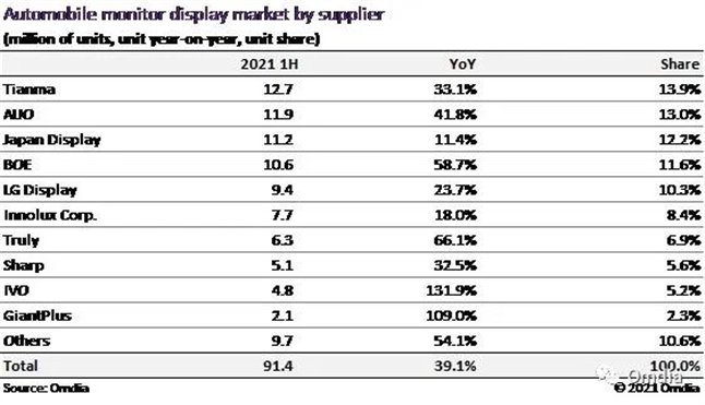 自2020年二季度以来,天马已经取代日本显示器,成为总市场和仪表盘显示市场的领导者。今年天马持续稳居第一名的位置,上半年取得13.9%的市场份额。友达则取得13.0%份额,取代了日本显示器 (12.2%),成为第二大出货面板厂,京东方以11.6%的份额飙升至第四名,超过乐金显示的10.3%份额。