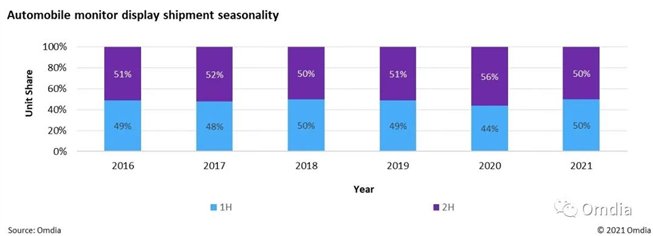 目前各国正在走向逐步解封的方向,汽车需求持续增加,面板厂对于下半年的车用面板需求持续看好,然而仍然持续受到驱动IC数量不足影响交货量问题。另外,从第二季度开始许多车厂遇到半导体零件短缺造成停工,而减缓了拉货力道。Omdia预期整年度的高峰将落在第一季度,第二季度和第三季度面板出货微幅调整后,第四季再度回升。整年出货为182.9百万片,同比22.7%。上半年和下半年的季节性比例为50%比50%。
