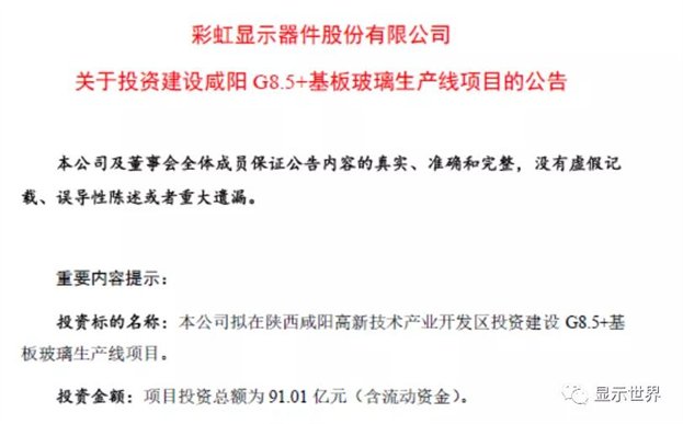 彩虹显示器件股份有限公司关于投资建设咸阳G8.5+基板玻璃生产线项目的公告