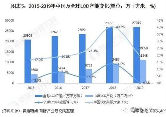 并且,随着多条LCD G8.5/G8.6以及G10.5代线、OLED G6代产线产能加速释放,我国LCD和OLED产能均保持高位增长,增速遥遥领先于全球面板产能增速,2018年我国LCD面板产能增速甚至达到了40.5%。2019年,我国LCD和OLED产能分别达到了11348万平方米和224万平方米,分别同比增长19.6%和19.8%。