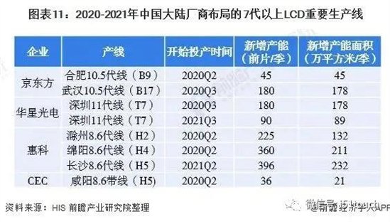 目前,中国LCD生产厂商也主要是在高世代LCD上进一步布局,2020-2021年京东方、华星光电、惠科、CEC陆续在2020-2021年中国大陆投产共计8条7代以上的重要生产线。