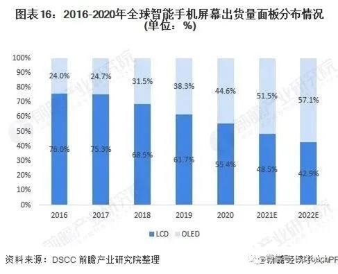 此外,OLED在智能手机领域替代LCD已经渐成趋势,苹果、华为、三星、OPPO、Vivo等手机品牌已经将OLED屏应用到手机显示中。根据DSCC数据显示,全球智能手机屏幕OLED面板出货量占比已经由2016年的24%上升至2020年的44.6%。预计2021年全球智能手机OLED出货量将开始超过LCD,2022年占比将达到57.1%。
