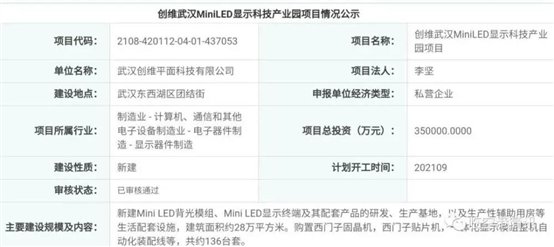 上季度签约落户临空港的创维Mini LED项目正式落地,并对选址团结街某地块进行项目建设。该项目由武汉创维平面科技有限公司投资建设,根据备案信息项目本次先行投资35亿元(整个产业计划是不低于100亿的投资),将新建Mini LED背光模组、Mini LED显示终端及其配套产品的研发、生产基地,以及生产性辅助用房等生活配套设施,建筑面积约28万平方米。