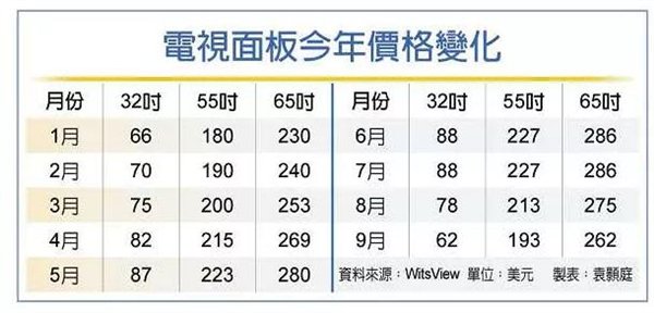 32吋、43吋等小尺寸电视面板价格连续两个月大跌,9月份报价分别来到62美元、106 美元,相当于回到今年年初的水准,第三季大跌超过两成。大尺寸电视面板从8月起走跌,55、65吋 9月报价分别跌至193、260美元,平均来看第三季跌幅也高达8~15%。