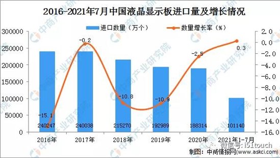 据中商产业研究院数据库显示,2021年1-7月中国液晶显示板进口量101140万个,同比增长0.3%。