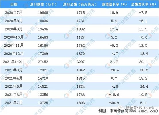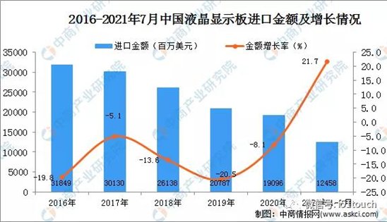 从金额方面来看,2021年1-7月中国液晶显示板进口金额12458百万美元,同比增长21.7%。