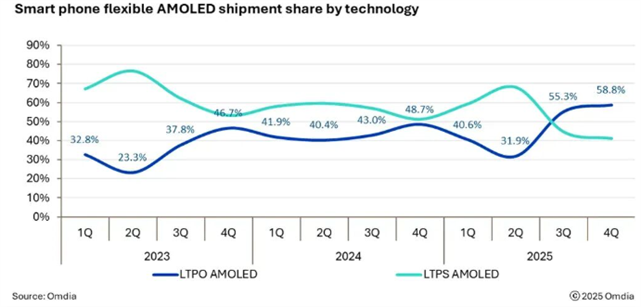 9月30日消息,根据Omdia的最新《OLED显示屏市场追踪报告》,低温多晶氧化物(LTPO)柔性有源矩阵有机发光二极管(AMOLED)的出货量预计将在2025年下半年超过低温多晶硅(LTPS)柔性AMOLED。