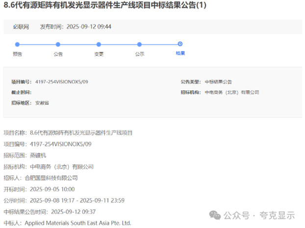 近期,维信诺(002387)(002387.SZ)布局的第8.6代AMOLED生产线项目迎来新进展,多项重要设备采购已确认中标方。根据必联网信息显示,合肥国显科技有限公司(下称"合肥国显")负责建设的8.6代AMOLED生产线项目的蒸镀机、曝光机、磁控溅射设备等设备公告了中标结果。