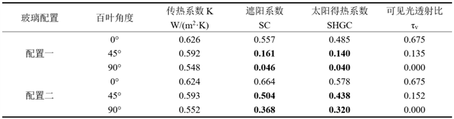 则,两种配置内置百叶真空中空玻璃光学热工参数计算结果,见下表。