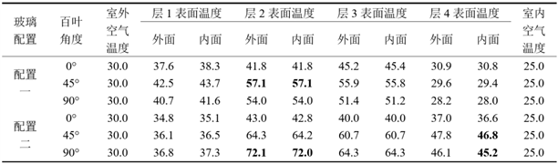 可见,百叶/真空玻璃位置对内置百叶中空玻璃室内侧表面温度影响明显。以叶片45°为例,配置二真空玻璃位于室外侧时,室内玻璃表面温度46.8℃;