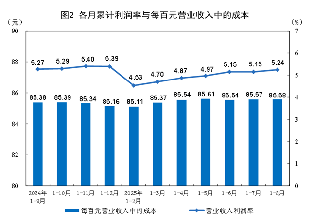 1—8月份,规模以上工业企业每百元营业收入中的成本为85.58元,同比增加0.19元;每百元营业收入中的费用为8.37元,同比减少0.08元。