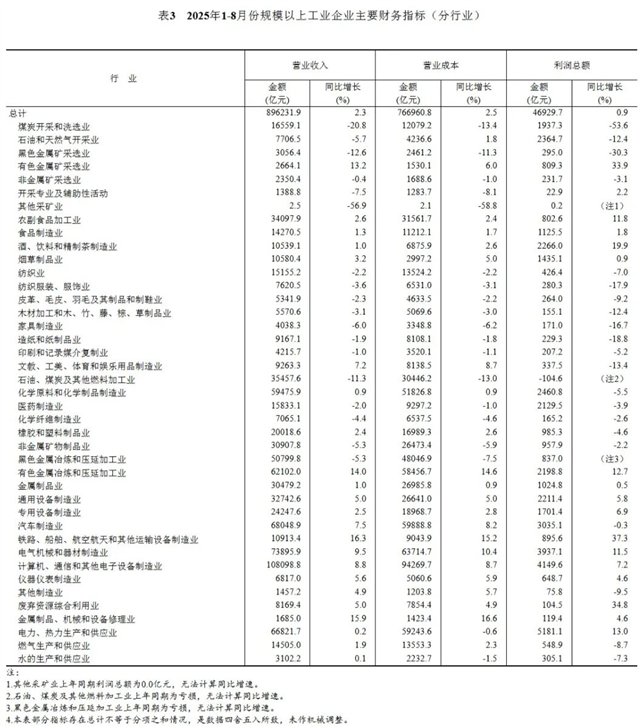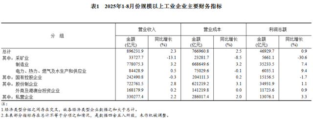 1—8月份,采矿业实现利润总额5661.1亿元,同比下降30.6%;制造业实现利润总额35233.5亿元,增长7.4%;电力、热力、燃气及水生产和供应业实现利润总额6035.1亿元,增长9.4%。