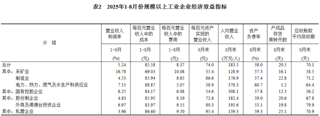 8月末,规模以上工业企业每百元资产实现的营业收入为74.0元,同比减少2.0元;人均营业收入为183.5万元,同比增加5.7万元;产成品存货周转天数为20.5天,同比增加0.1天;应收账款平均回收期为70.1天,同比增加3.7天。