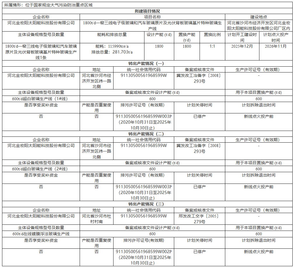 河北金宏阳太阳能科技股份有限公司1800t/d一窑三线电子级玻璃和汽车玻璃原片及光伏背板玻璃基片特种玻璃生产线项目产能置换方案