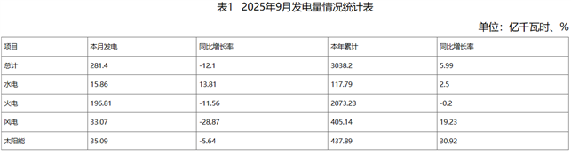 (一)发电量情况。9月份当月,全省发电量281.4亿千瓦时,同比减少12.1%。其中水电15.86亿千瓦时,同比增加13.81%;火电196.81亿千瓦时,同比减少11.56%;风电33.07亿千瓦时,同比减少28.87%;太阳能35.09亿千瓦时,同比减少5.64%。