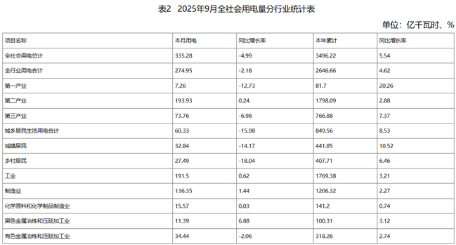 (一)全社会用电量情况。9月份当月,全省全社会用电量335.28亿千瓦时,同比减少4.99%。