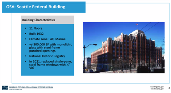 此楼建于1932年,规模很大,占了一整个街区,见图1。原本全是单层普通白玻搭配钢窗框的双提拉窗,但目前绝大多数都固定住了,无法开合。此楼被列入了国家历史建筑名录,这对项目影响很大,被选为美国总务管理局(GSA)的绿色实验项目,得到资助。2021年这栋楼的所有窗户保留了钢窗框,玻璃更换成VIG。