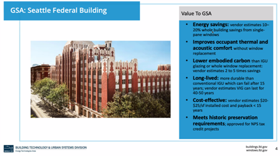 针对行业对VIG认知不足,应加强对建筑师、开发商、业主等群体的科普教育,强调VIG在节能和耐久性(40-50年寿命)的认知,除动员媒体对VIG加强宣传外,会议特别强调示范建筑的作用,联邦/州级政府机构应带头把自用建筑作为窗户节能改造的示范建筑,让各群体实际感受VIG的优点,解除各种疑虑,提高市场认知度,利于VIG 大规模推广。
